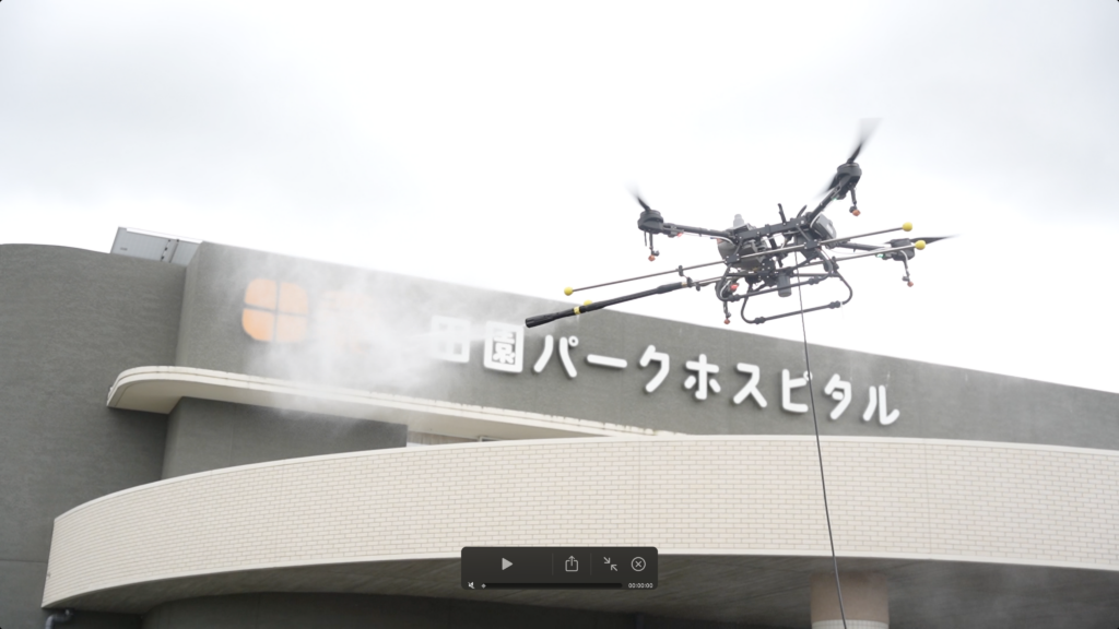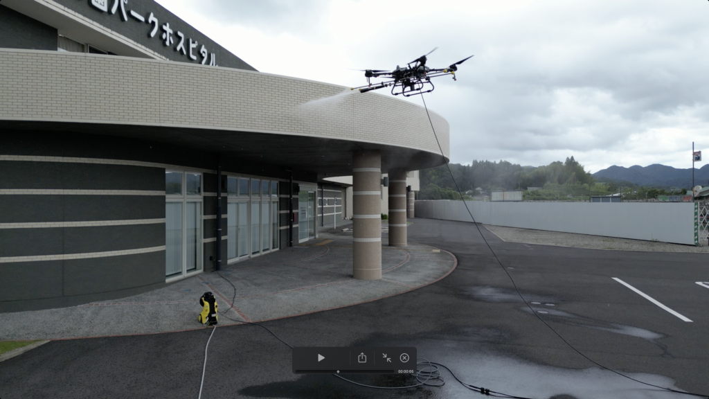 ドローンに高圧洗浄ノズルを取り付け高所での高圧洗浄を行なっています。