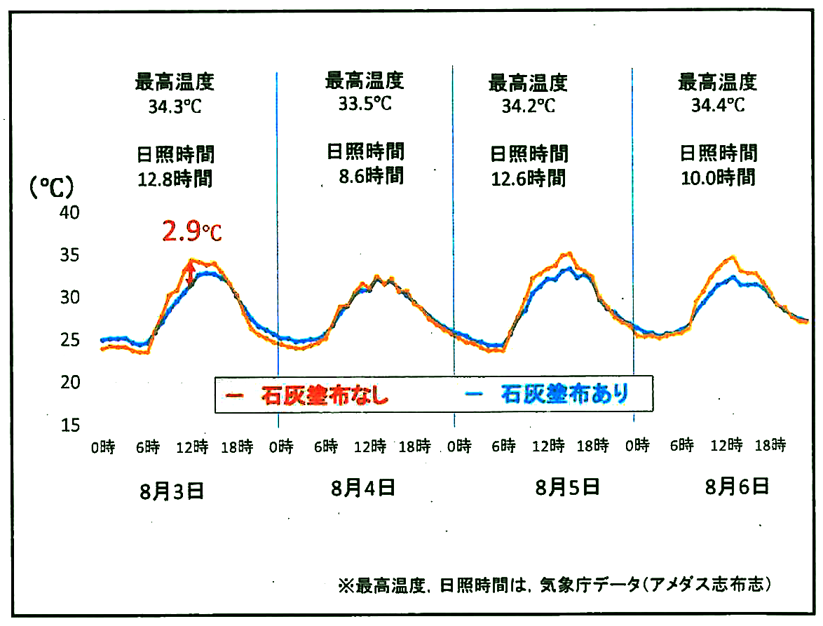 検証の結果、消石灰を塗布することで屋根表面温度が約20℃低下し、畜舎内の気温も約3℃下がることが確認されています。